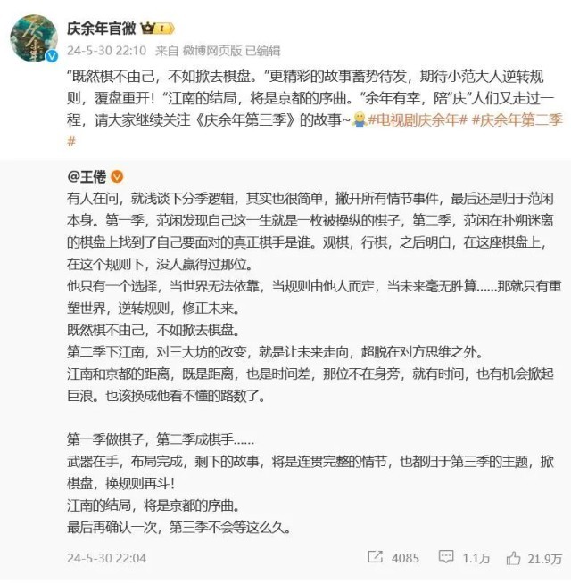 解锁大结局当晚,该剧编剧王倦发长文谈分季逻辑。他表示分季逻辑很简单,撇开所有情节事件,最后还是归于范闲本身。第一季,范闲发现自己这一生就是一枚被操纵的棋子,第二季,范闲在扑朔迷离的棋盘上找到了自己要面对的真正棋手是谁。江南的结局,将是京都的序曲。王倦还透露第三季不会等这么久,主题是换规则再斗。