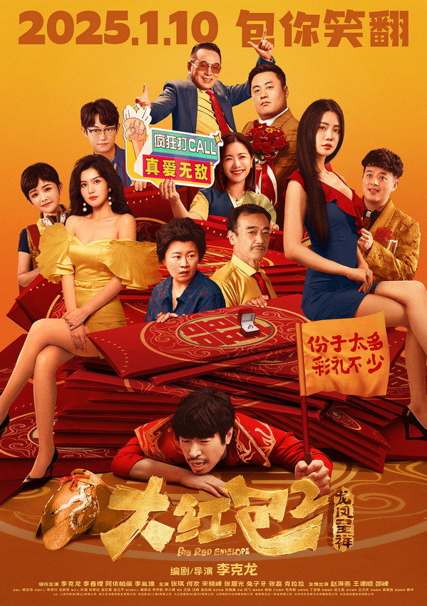 由李克龙导演,李克龙、李春嫒领衔主演,张琪、张晨光、何欢、宋晓峰、阿依帕丽等主演的喜剧电影《大红包2:龙凤呈祥》今日发布定档预告和海报,将于2025年1月10日上映。2021年的《大红包》作为贺岁喜剧电影黑马,不仅取得了2.35亿票房的好成绩,也让观众们更加期待这部有着更多欢笑和惊喜的续作回归。拿不出彩礼的失意编剧为了娶到心爱姑娘为自己制定了“六部计划”,由此引发的一出关于探讨真爱的欢乐喜剧。本部续作不仅有大众喜闻乐见的熟脸喜剧演员,更有高颜值、超搞笑的热门网红博主加盟,为观众呈现开年最轻松、最解压的喜剧爽片。1月10日走进影院,新年第一笑!