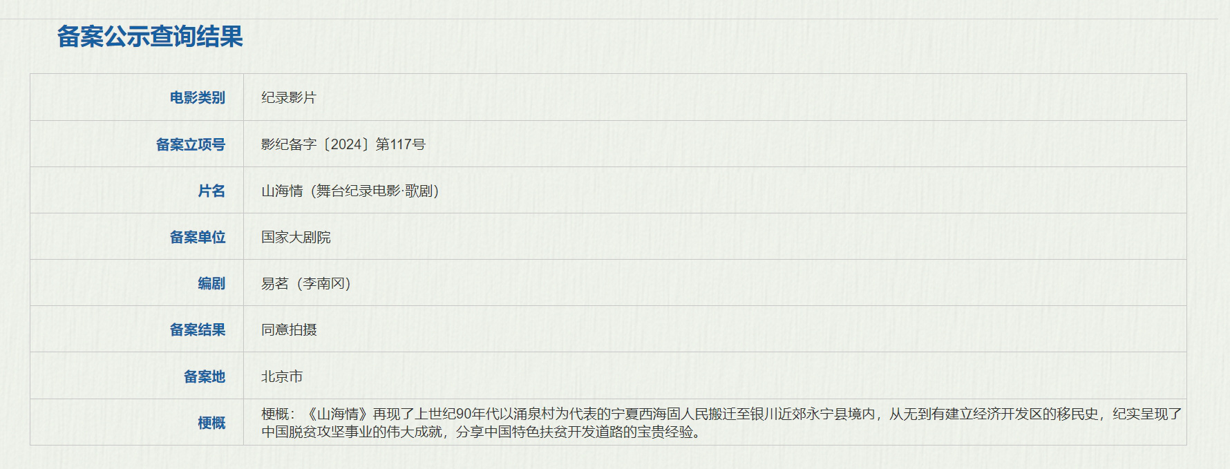 1905电影网讯 12月13日,国家电影局发布关于2024年11月上全国电影剧本(梗概)备案、立项公示的通知,《山海情(舞台纪录电影·歌剧)》立项,备案单位为国家大剧院。
