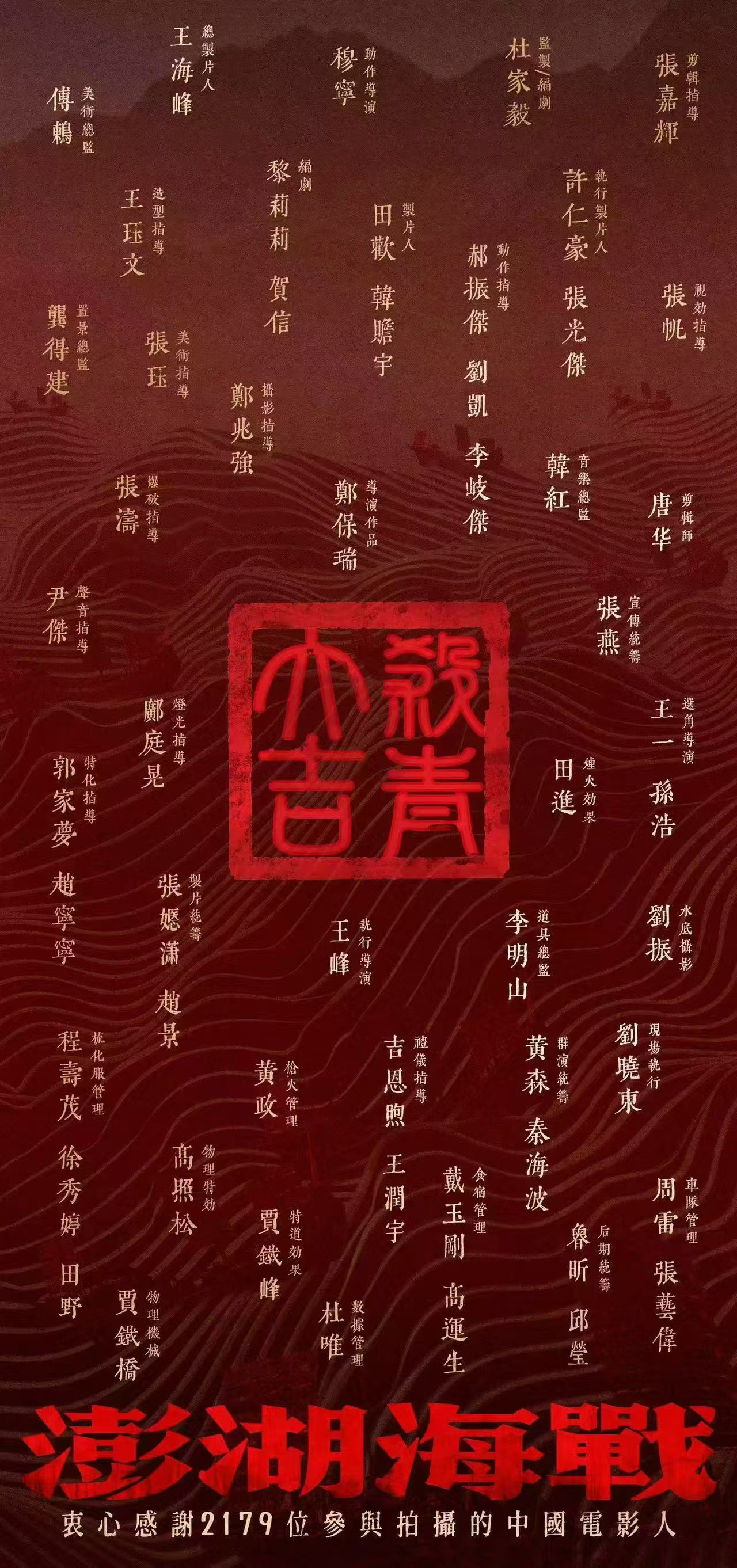 近日,由郑保瑞执导的电影《澎湖海战》杀青,并发布海报。海报以导演郑保瑞等幕后主创姓名组成,并写下“衷心感谢2179位参与拍摄的中国电影人”。