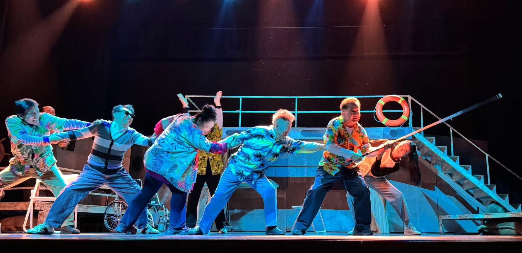 黄兆函是中国国家话剧院的青年演员,这是她第一次尝试编剧、导演,就选择了老年题材。《乘风破浪》的故事由两层叙事结构嵌套而成:两位年轻演员所在的剧组遭遇“资方跑路”,二人为了还债“盯”上了银发一族,租了一条破旧的游船,谎称可以低价带老人们出海游玩;几位老年人抱着各自的目的登上游船,3天海上旅程中,老人们各自的经历和内心的秘密被逐渐揭开,也触及了整个故事的“戏核”——老年人的心理需求也应该被看见。
