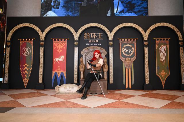 易守难攻的海尔姆深谷号角堡,洛汗王国首都埃多拉斯金殿的王座,巨型艺术长卷轴呈现影片九大名场面,充满厚重史诗感,吸引观众粉丝纷纷拍照留念。高悬的洛汗旗帜与主角合影立牌吸引众多粉丝驻足围观,近距离感受洛汗传奇人物的魅力。此外,不少硬核粉丝以精致妆容cos中土经典角色前来观影,可见《指环王》系列在观众心中非同一般的地位。