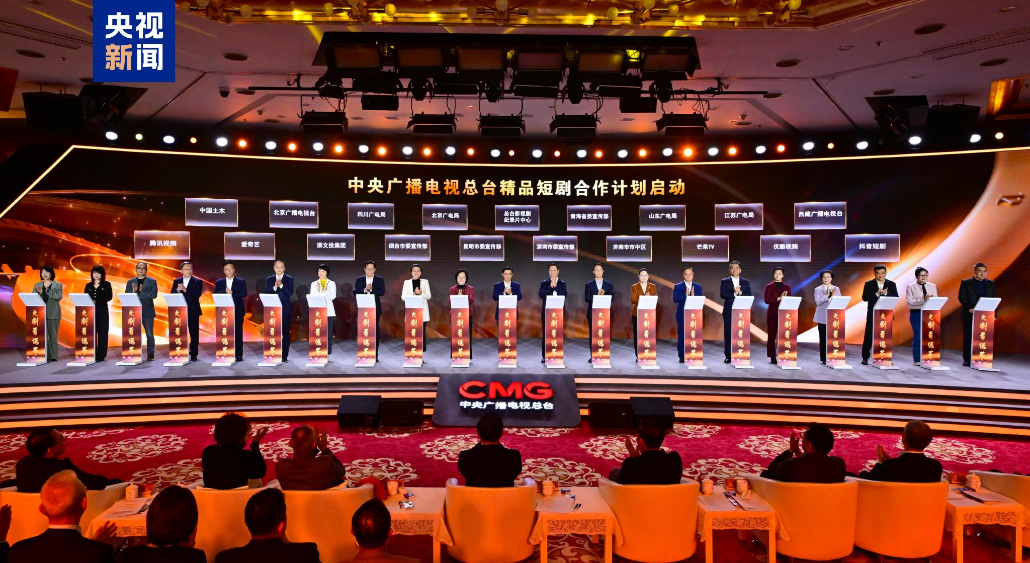 12月10日,中央广播电视总台2025“大剧看总台”电视剧片单发布活动在京举行,47部总台大剧及8大系列精品短剧亮相,立精品之柱,谱共鸣新章。中宣部副部长、中央广播电视总台台长慎海雄出席,并与北京市委常委、宣传部部长、政法委书记孙军民,上海市委常委、宣传部部长赵嘉鸣,浙江省委常委、宣传部部长赵承,江西省委常委、宣传部部长卢小青,山东省委常委、宣传部部长白玉刚,西藏自治区党委常委、宣传部部长汪海洲,青海省委常委、宣传部部长王大南,新疆维吾尔自治区党委常委、宣传部部长、教育工委书记王建新等嘉宾共同为2025“大剧看总台”启幕。