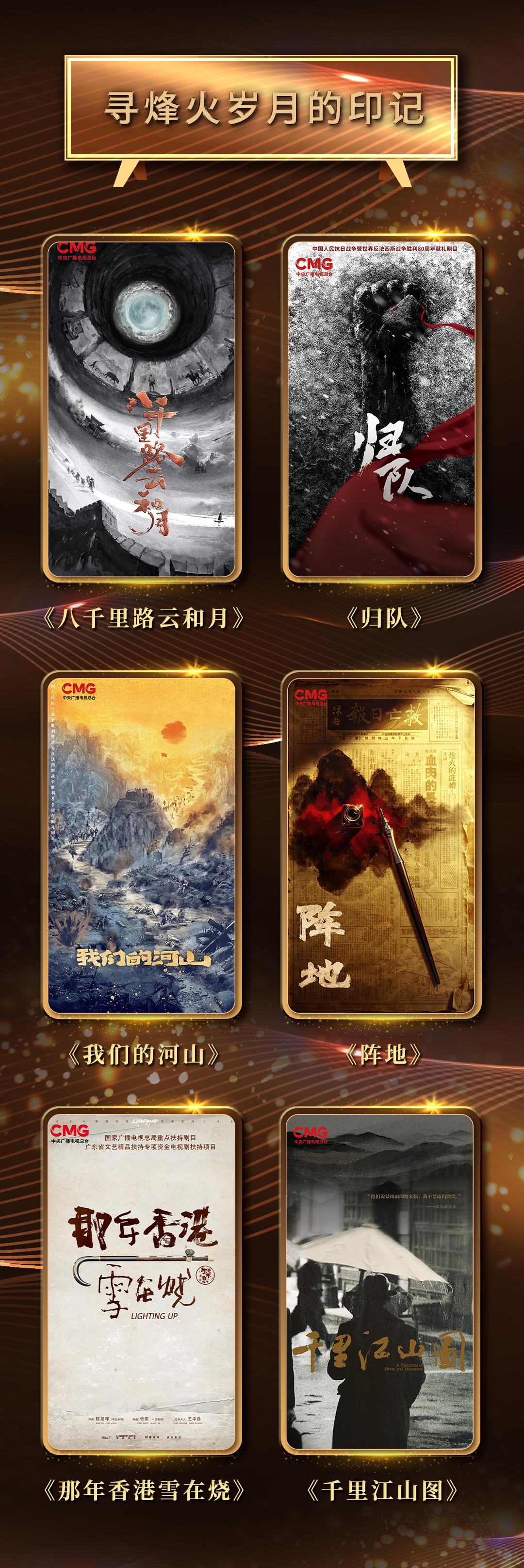“寻烽火岁月的印记”板块围绕中国人民抗日战争暨世界反法西斯战争胜利80周年这一重要时间节点,推介6部高质量剧目,构筑起一幅幅绵延厚重的热血画卷,传递振奋人心的精神力量。《八千里路云和月》《归队》《我们的河山》《阵地》以抗日战争时期为背景,讲述中国共产党和爱国民主人士等在战火纷飞的岁月里坚韧战斗、保家卫国的感人故事,生动展现伟大的抗战精神和民族力量;《那年香港雪在烧》展现1884至1899年间在港谋生的华人逆天改命,在黑暗中寻找前途和尊严的爱国主义历史传奇;《千里江山图》改编自茅盾文学奖同名获奖小说,描写共产党人以坚定信仰保卫党的秘密,最终取得胜利的故事。