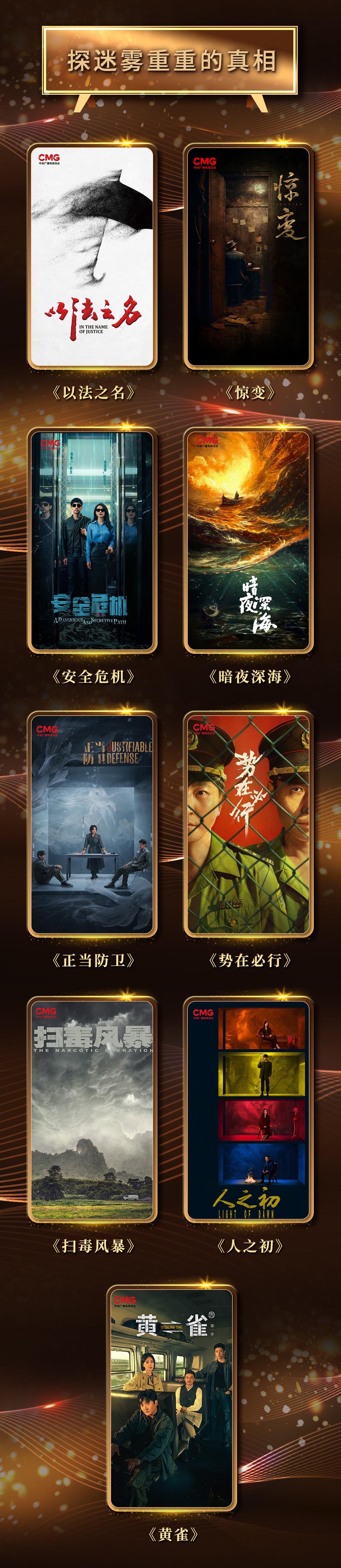 “探迷雾重重的真相”板块围绕悬疑、推理题材,推介9部精品剧集,带领观众在引人入胜的故事中探寻隐藏深处的真相,凸显理想信念的光辉。《以法之名》首次聚焦检察院第十一检察部,全面展现“检察向”扫黑除恶的故事;《惊变》取材于“龙潭三杰”钱壮飞、李克农、胡底的真实经历;当代反谍大剧《安全危机》生动展现与敌对势力惊心动魄的斗争;《暗夜深海》讲述为祖国统一大业作出贡献的地下工作者的事迹;《正当防卫》《势在必行》《扫毒风暴》生动诠释当代公检法一线工作人员的精神风貌;《人之初》探寻尘封旧案的真相;《黄雀》讲述本世纪初铁路反扒精英的故事。