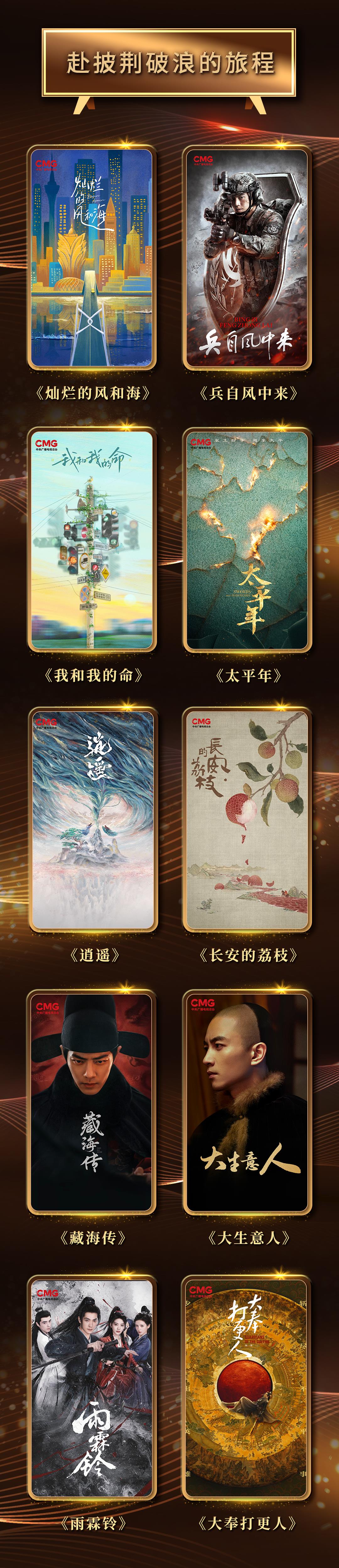 “赴披荆破浪的旅程”板块立足时代主题、民生热点,推出10部人生故事,与观众一起共赴不被定义的人生之旅。《灿烂的风和海》多维度展现澳门青年精神风貌;军旅力作《兵自风中来》中,新时代军人上演实战军演,磨砺意志技能、逐渐形成新质战斗力;《我和我的命》改编自梁晓声长篇小说,以绵长时间跨度承载厚重的年代质感与人物命运沉浮;《太平年》落墨五代十国到北宋统一年间,讲述吴越国“纳土归宋”的历史故事;《逍遥》尽展赤子之心、侠骨柔肠;《长安的荔枝》改编自马伯庸同名小说,生动描绘“一骑红尘妃子笑,无人知是荔枝来”诗句背后的惊涛骇浪;《藏海传》《大奉打更人》展开一段段智搏奸佞、守卫家国的故事;《雨霖铃》以北宋年间为背景,展开惊险探案之旅;《大生意人》描绘一代“商王”的热血奋斗史。