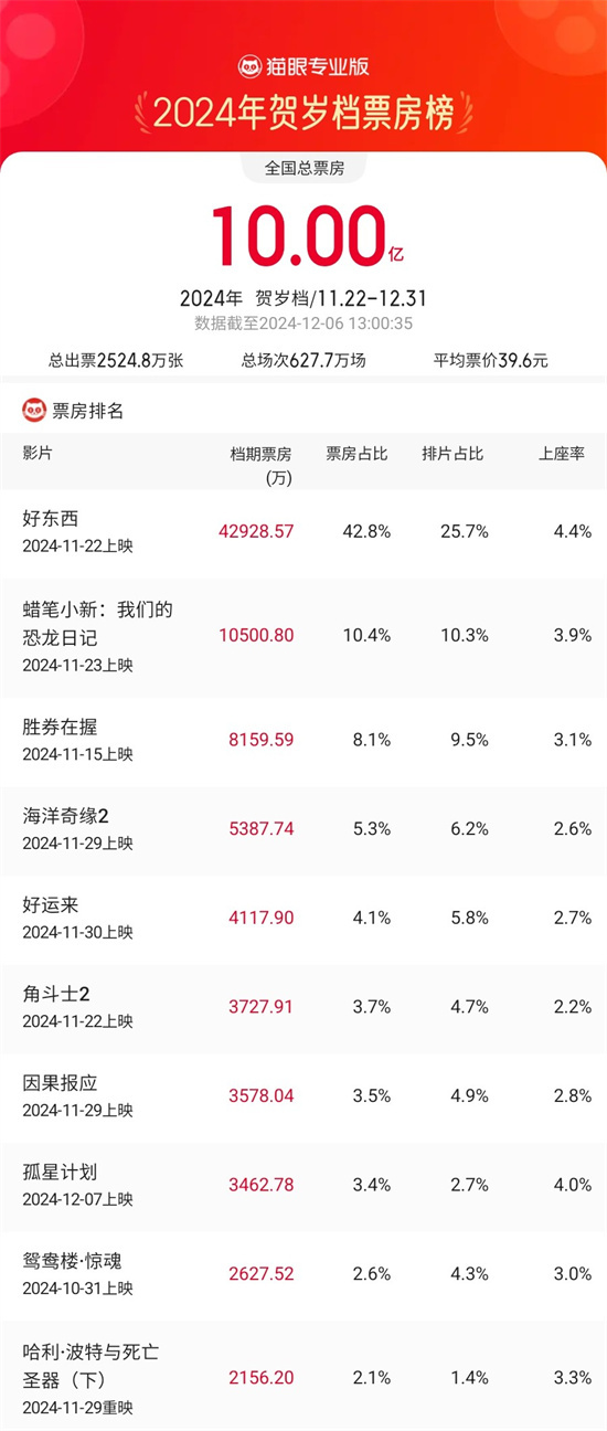 据猫眼专业版,截至12月6日下午1点,2024年贺岁档(11.22-12.31)累计票房已达10亿人民币,观影人次达2524.8万,观影场次达627.7万场,贺岁档片单数量达到68部。其中,电影《好东西》《蜡笔小新:我们的恐龙日记》《胜券在握》《海洋奇缘2》《好运来》分获前五名。