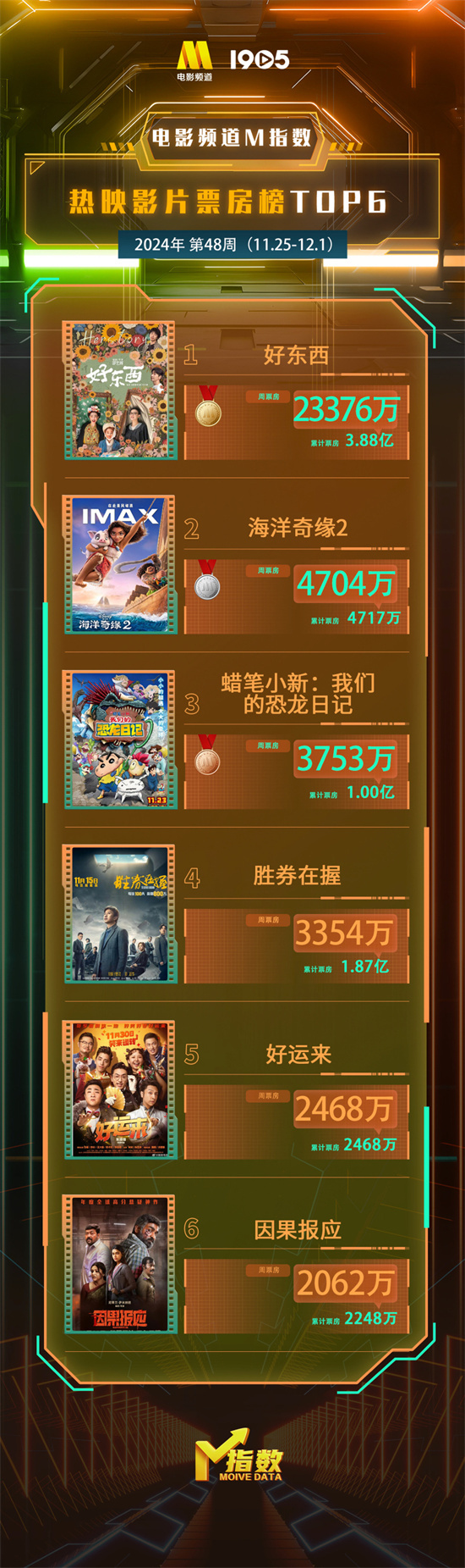 “电影频道M指数”2024年第48周结果新鲜发布。11月25日-12月1日,“电影频道M指数”热映影片票房榜前6位依次为: