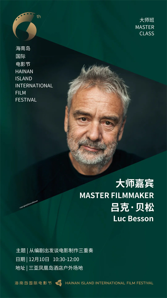 12月10日上午10:30-12:00,吕克·贝松将亲临第六届海南岛国际电影节大师班,以“从编剧出发谈电影制作三重奏”为主题,倾囊相授。从编剧的灵感激发到创作持续性的保持,从导演的视觉化呈现到风格化塑造,从制片的角色转换到商业艺术的权衡,吕克·贝松将全方位解读电影制作的奥秘。