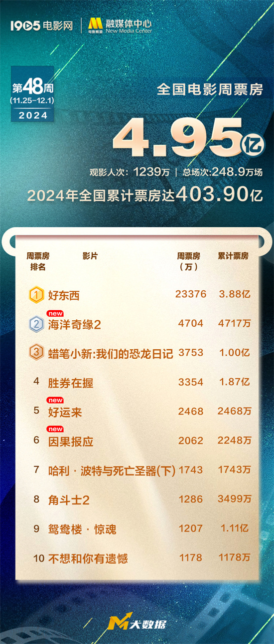 第48周(11.25-12.1)全国电影周票房4.95亿,观影人次超1239万,全年电影票房累计403.90亿元。