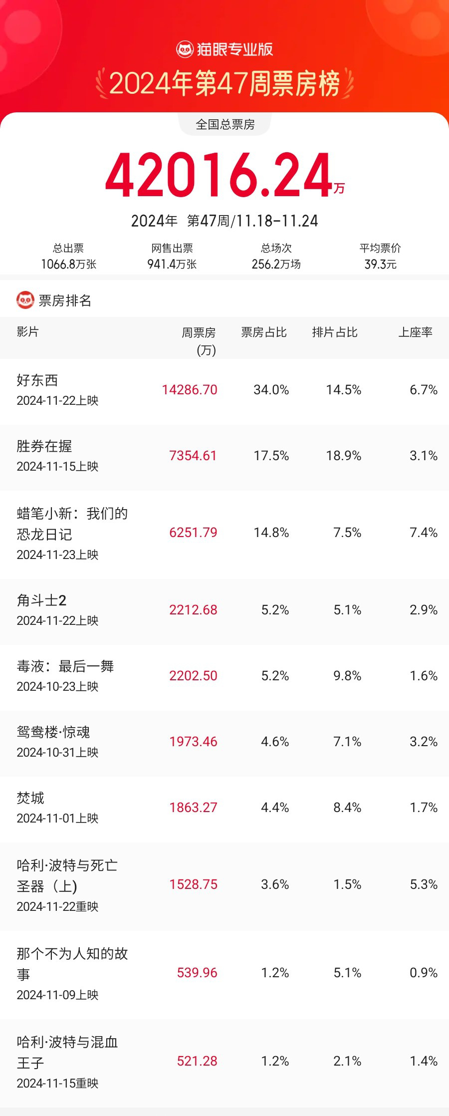1905电影网专稿 2024年第47周(11月18日至11月24日),影市大盘报收约4.2亿。当周话题热度持续飙升的《好东西》票房超1.4亿。排名次席和第三位分别是上映次周的《胜券在握》和新片《蜡笔小新:我们的恐龙日记》(以下简称《蜡笔小新》),两部影片单周票房为7300万 和6200万 。经典回归的《角斗士2》不及预期排名周榜第四,《毒液:最后一舞》则在开画一个月后依然稳于周榜TOP5之列,累计票房达到6.6亿。