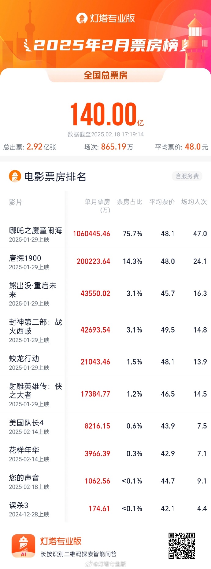 据统计,截至2月18日,2025年2月总票房(含预售)突破140亿。《哪吒之魔童闹海》贡献当月票房75.7%。