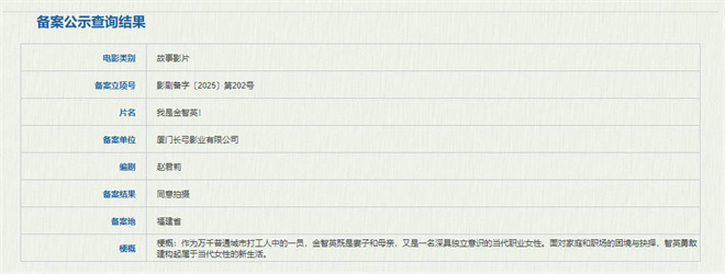 2月17日,国家电影局发布关于2025年1月上全国电影剧本(梗概)备案、立项公示的通知。由赵君莉担任编剧的电影《我是金智英!》备案立项。该片或改编自郑裕美、孔刘主演的韩国电影《82年生的金智英》。