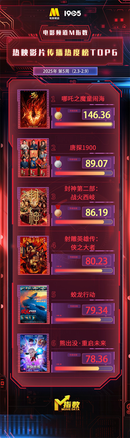 “电影频道M指数”2025年第5周结果发布。2月3日-2月9日,“电影频道M指数”热映影片传播热度榜前6位依次为: