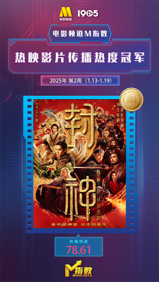 “电影频道M指数”2025年第2周结果发布。1月13日-1月19日,“电影频道M指数”热映影片传播热度榜前6位依次为: