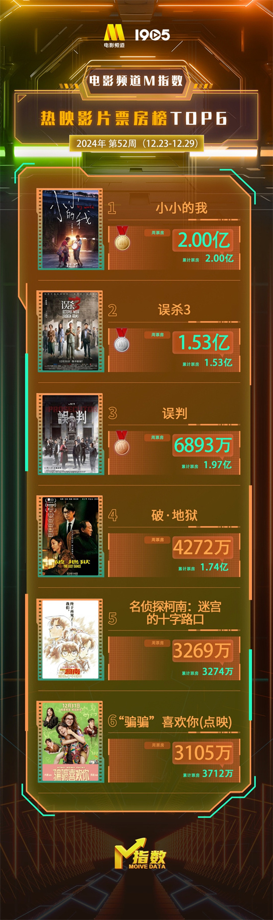 “电影频道M指数”2024年第52周结果新鲜发布。12月23日-12月29日,“电影频道M指数”热映影片票房榜前6位依次为: