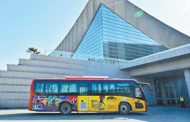 观众乘坐《雨中曲》专属接驳车到北京艺术中心观演。 本报记者 方非摄