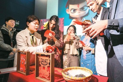 2月25日,在湖南省长沙市摩天轮国际影城,留学生们在志愿者(左二)的指导下学习非遗剪纸技艺,制作“哪吒”文创产品。