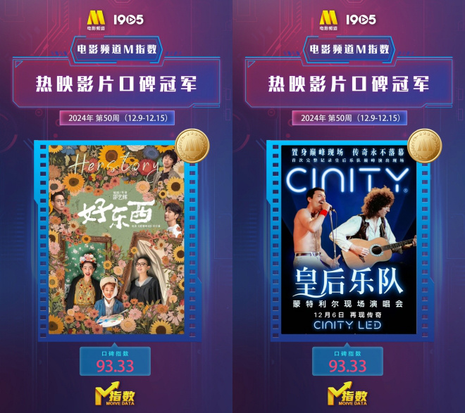 近日,电影频道M指数2024年第50周结果新鲜发布。12月9日-12月15日,“电影频道M指数”热映影片传播热度榜前6位依次为: