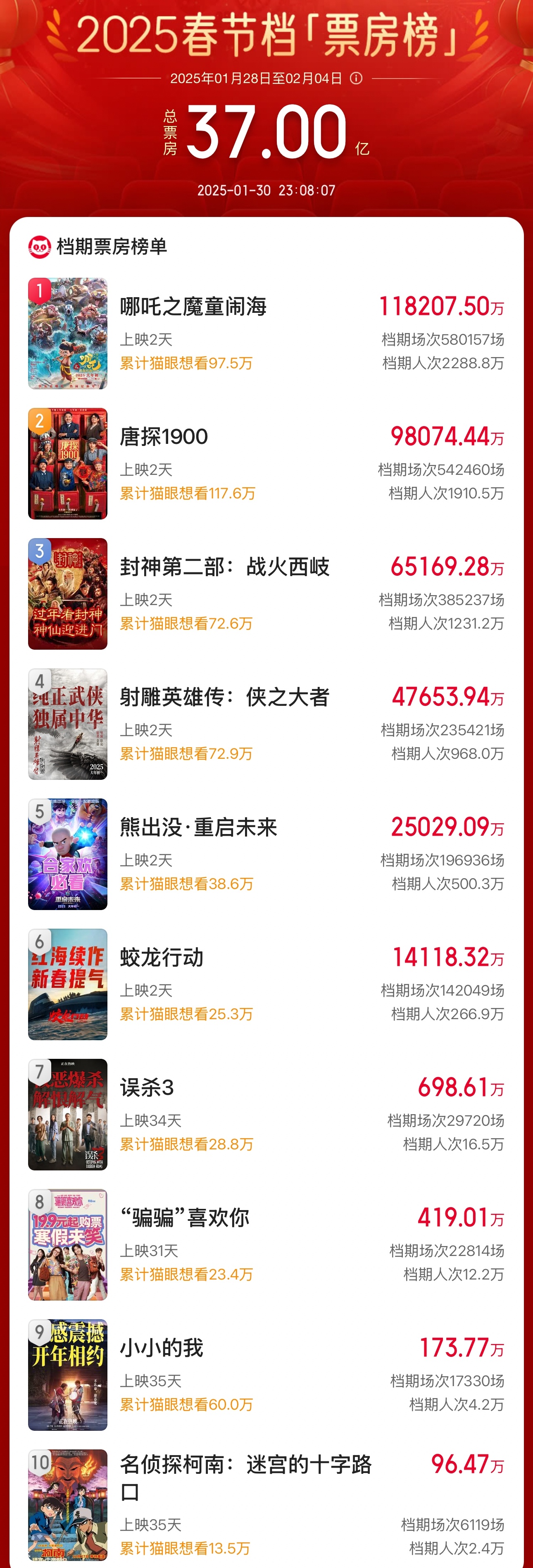 破37亿!2025年春节档电影总票房再创新高 - 超景影院