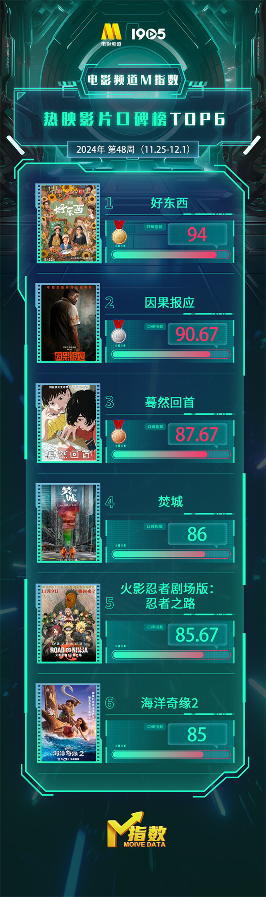 “电影频道M指数”2024年第48周结果新鲜发布。11月25日-12月1日,“电影频道M指数”热映影片口碑榜前6位依次为: