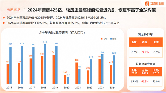 在2024年全球票房同比下降5.6%的背景下,国内电影市场取得425.02亿的票房成绩,较历史最高峰值恢复约七成,恢复率好于全球均值。
