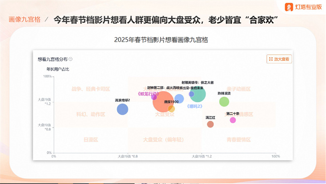 根据灯塔专业版实时宣发数据,2025年春节档影片映前90天至映前17天新增想看超218万,创历史同期新增想看新高,《封神第二部:战火西岐》《射雕英雄传:侠之大者》《哪吒之魔童闹海》位列映前想看TOP3,《封神第二部:战火西岐》和《射雕英雄传:侠之大者》累计想看人数更是率先突破百万。合家欢属性强、受众稳定的“熊出没”在历年春节档票房节节攀升,今年依旧有望继续担任检验头部影片成色的“梯队判官”。