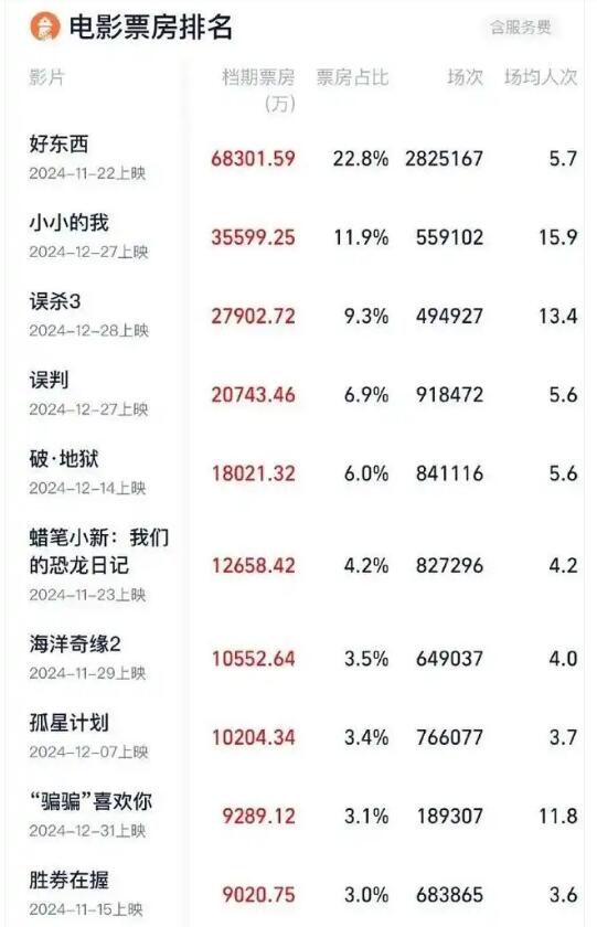 据网络平台数据,截止12月31日20时32分,2024贺岁档(11月22日-12月31日)票房破30亿,影片《好东西》《小小的我》《误杀3》《误判》《破·地狱》位列档期票房前五名。