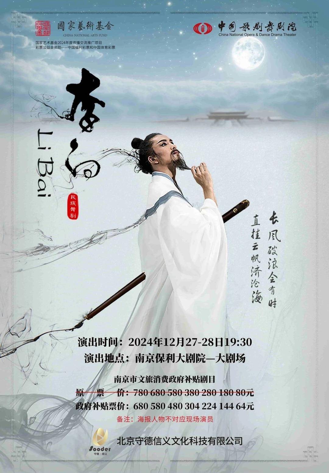 今年以中国传统文化为题材的舞剧仍是精彩不断,在南京压轴上映的是一部重磅作品,即中国歌剧舞剧院打造的舞剧《李白》。该剧讲述的是,安史之乱后,晚年的李白毅然从军,却因永王兵败被发配夜郎。这让他回忆起自己“入世”的前前后后——从皇宫内的扶摇直上、意气风发,到因大臣忌恨、群臣谗言,辞官翰林院,走入山水……李白人生中的几个主要节点分别以“月夜思”“仗剑梦”“金銮别”“九天阔”“鹏捉月”为题进行铺陈。