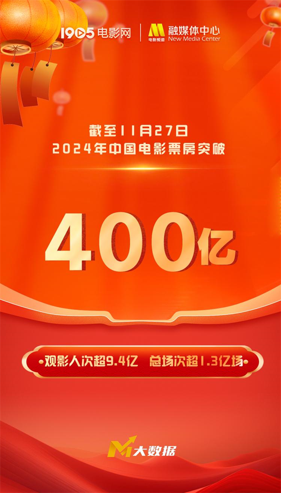 截至11月27日,2024年度全国电影票房(含预售实时)突破400亿元,观影人次超9亿。