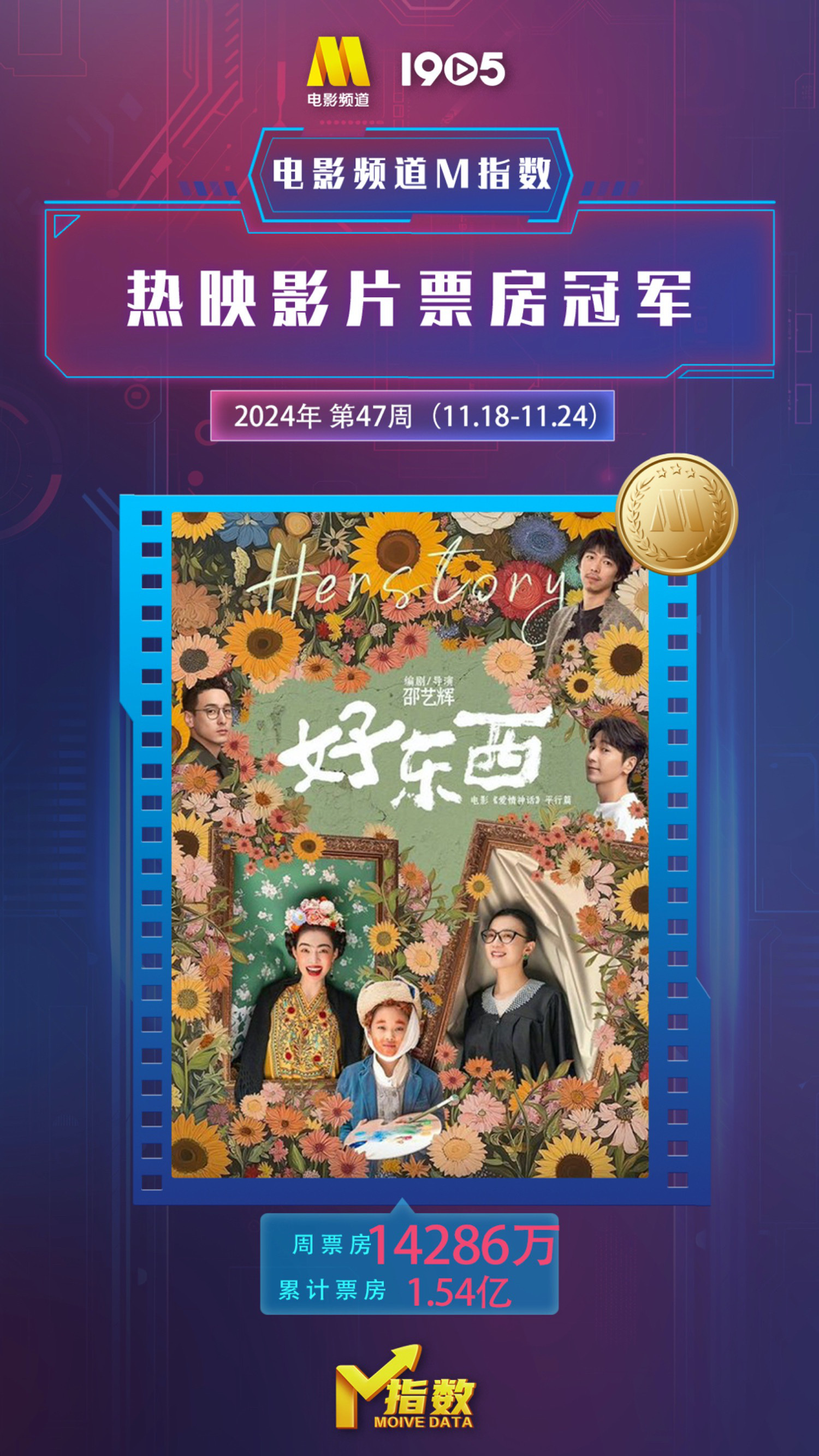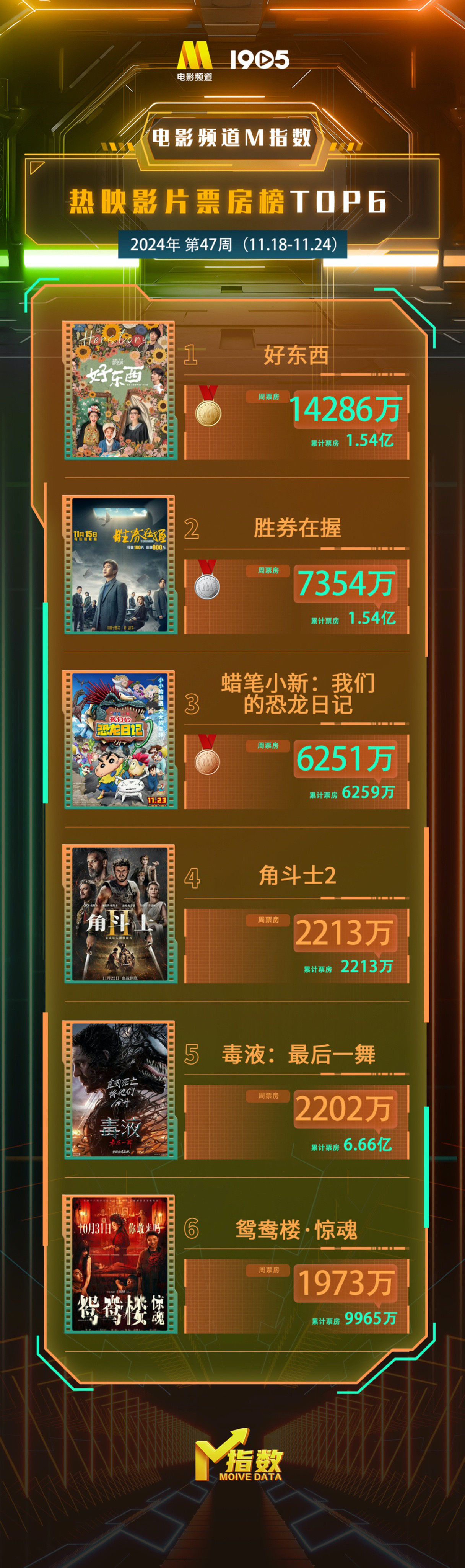 “电影频道M指数”2024年第47周结果新鲜发布。11月18日-11月24日,“电影频道M指数”热映影片票房榜前6位依次为: