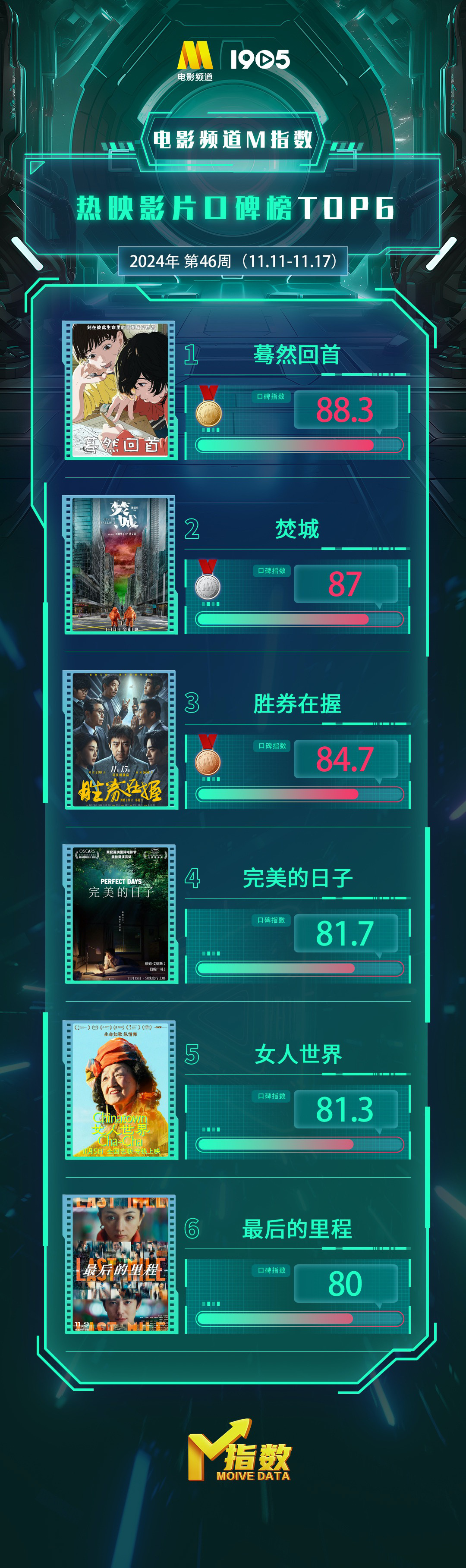 “电影频道M指数”2024年第46周结果发布。11月11日-11月17日,“电影频道M指数”热映影片口碑榜前6位依次为: