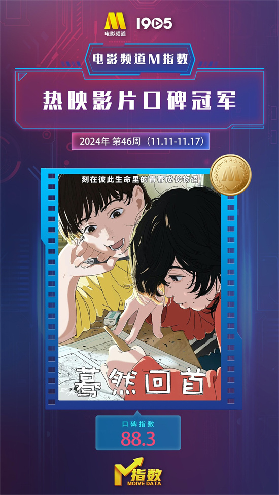 11月11日-11月17日,“电影频道M指数”热映影片传播热度榜前6位依次为: