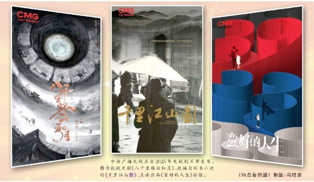 中央广播电视总台2025年电视剧片单发布,图为抗战大剧《八千里路云和月》、改编自同名小说的《千里江山图》、上海出品《蛮好的人生》海报。(均总台供图)制图:冯晓瑜