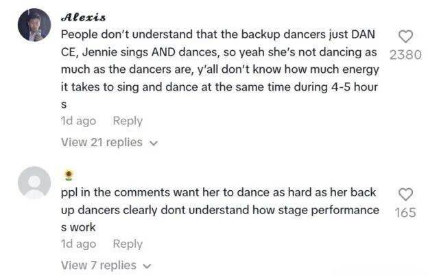起初,视频流出时,部分网友指责Jennie在集体舞蹈段落中动作幅度和力度不及伴舞,质疑其“划水”。这一说法迅速点燃了粉丝的辩护热情。许多粉丝指出,主唱在舞台上的角色定位与专业伴舞本就不同,需要兼顾演唱稳定性、镜头互动与整体台风,要求其全程保持与伴舞完全一致的超高强度并不合理。这场关于“敬业”与“角色分工”的辩论,尚未分出高下,就被另一股更引人侧目的声浪所覆盖。
