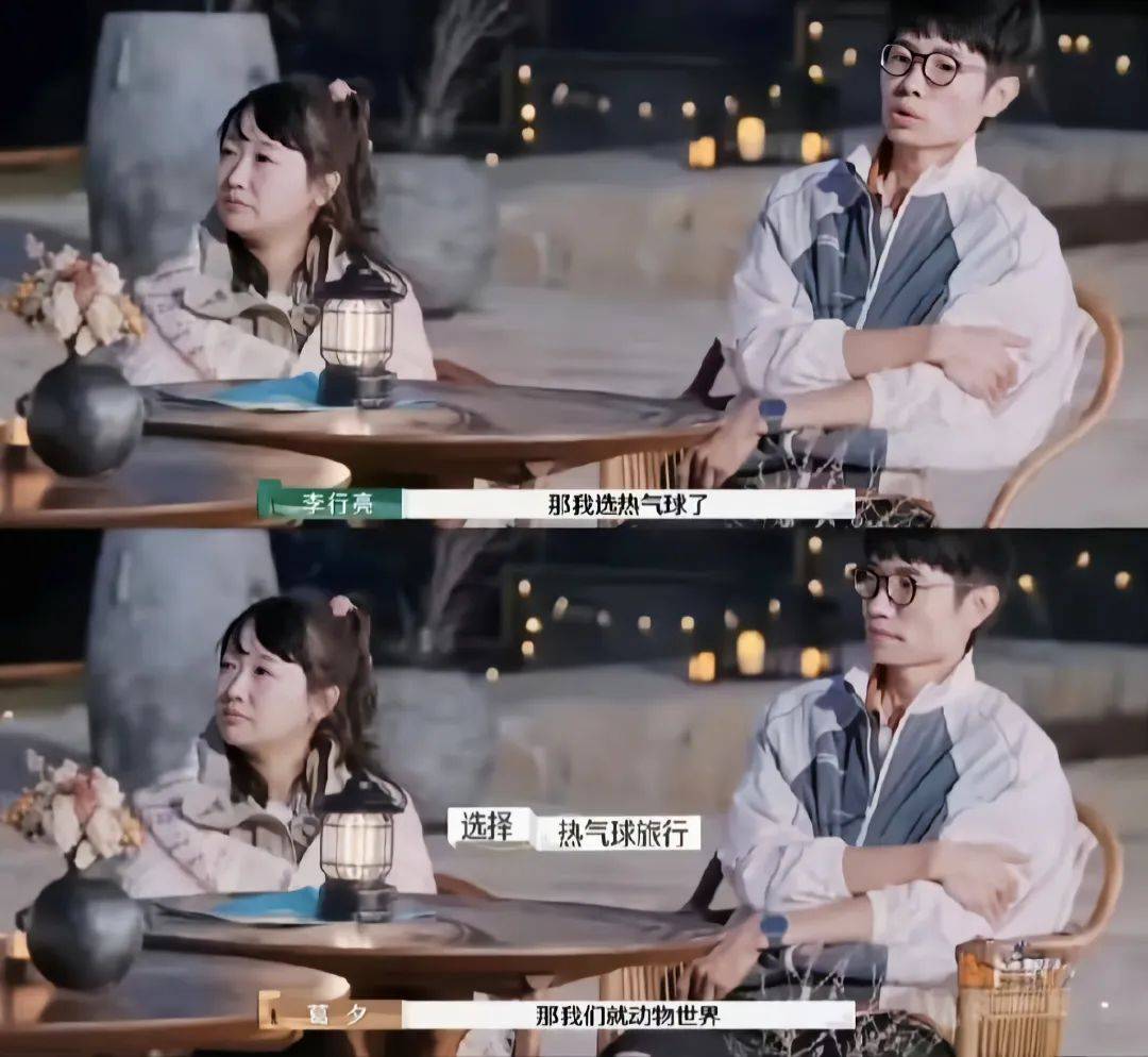 让她选,她不选,选择权给到李行亮,李行亮想维持正常人的体面游戏,替另外两对夫妻考虑,想委屈自己和老婆选动物世界。这个选择选不到麦琳的心趴上呀,所以她生气。