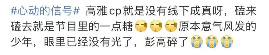 11月6日,《心动7》进行了陪看节目的更新,继孙乐言等三对CP回归陪看告白夜后,翁青雅和彭高也合体了,按照录制时间,中间至少间隔了两个多月,也是“高雅”CP为数不多的公开合体。俗话说“希望越大,失望越大”,很多CP粉本以为会疯狂吃糖,谁知两人不仅隔开走,还会下意识拉开距离,彭高更是一度黯然落泪,从眼睛里有星星到满眼失落和疲惫,眼神的变化装不了。