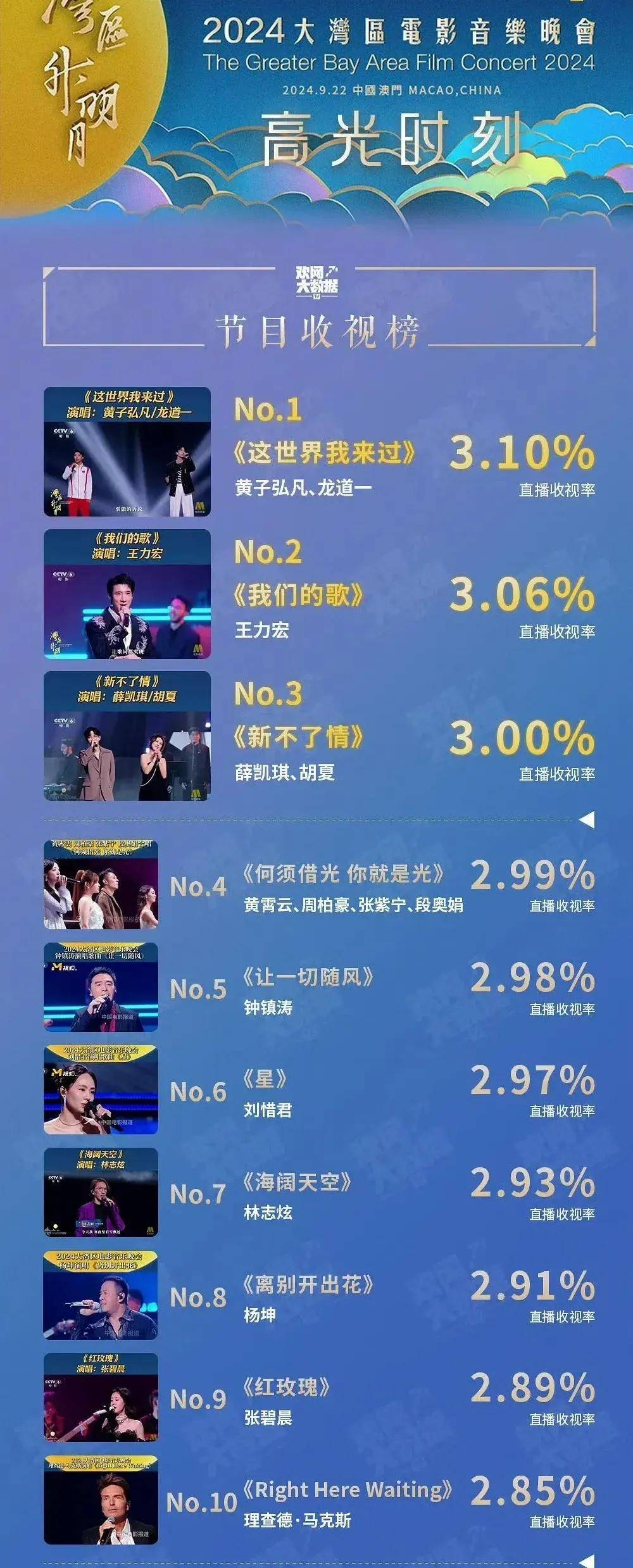 晚会当晚收视率排行出来,王力宏的独唱曲目《我们的歌》以3.06%的收视率斩获节目收视榜第二!领唱的《天地龙鳞》的反响也很高。