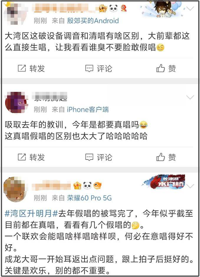 这次大湾区晚会可能是吸取到了之前的教训,全员真唱上阵,但是观众也表示导演收音实在太严格了,一点儿混响不给,这就导致观众听到的歌声像是话筒干音直出,干巴巴的,全靠歌手实力输出。