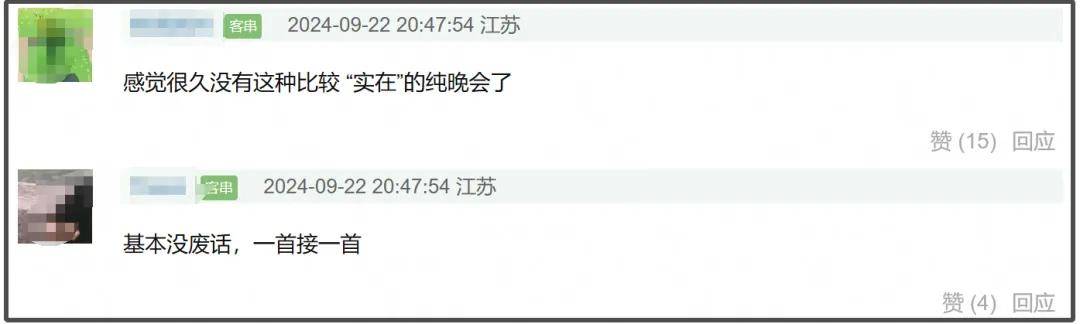 这次大湾区晚会和之前的中秋晚会也算是给内娱打了一个样,直播真唱和认真选歌都是晚会出圈的重要要素,就希望内娱能够多听取观众的意见,给大家带来更多精彩的晚会吧!