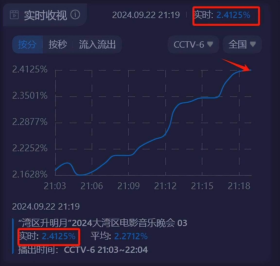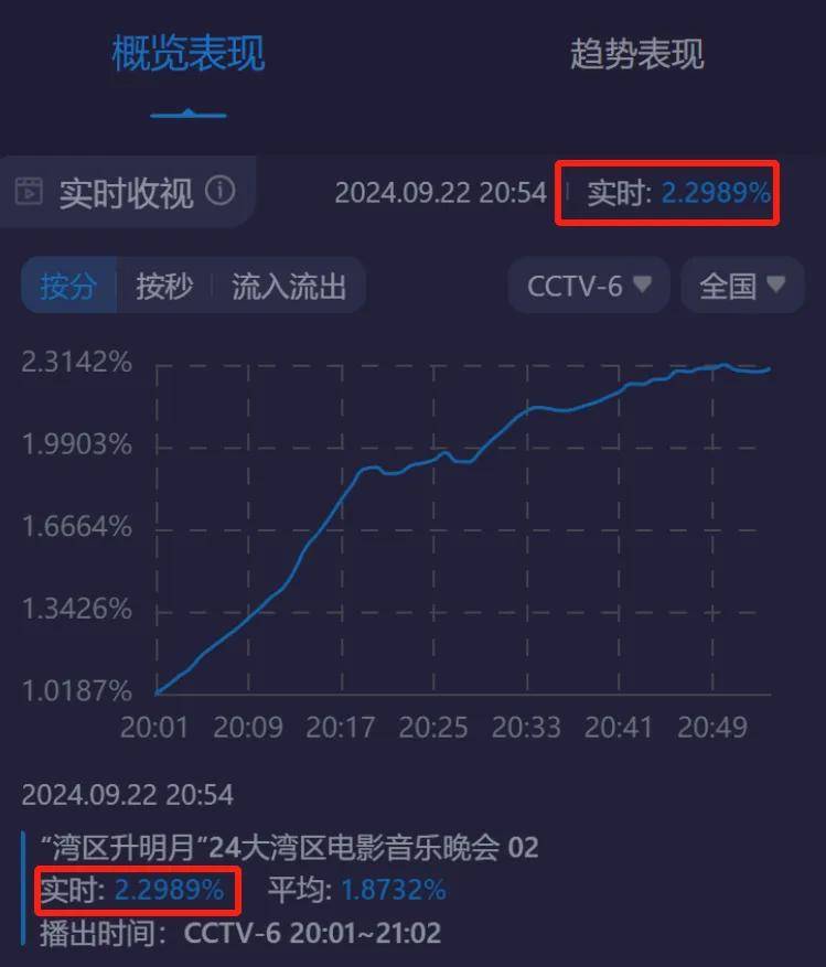 这么多精彩的节目和看点加持,大湾区晚会也不出意料地在开播不到1小时,收视率就破2,还有不断上涨的趋势。