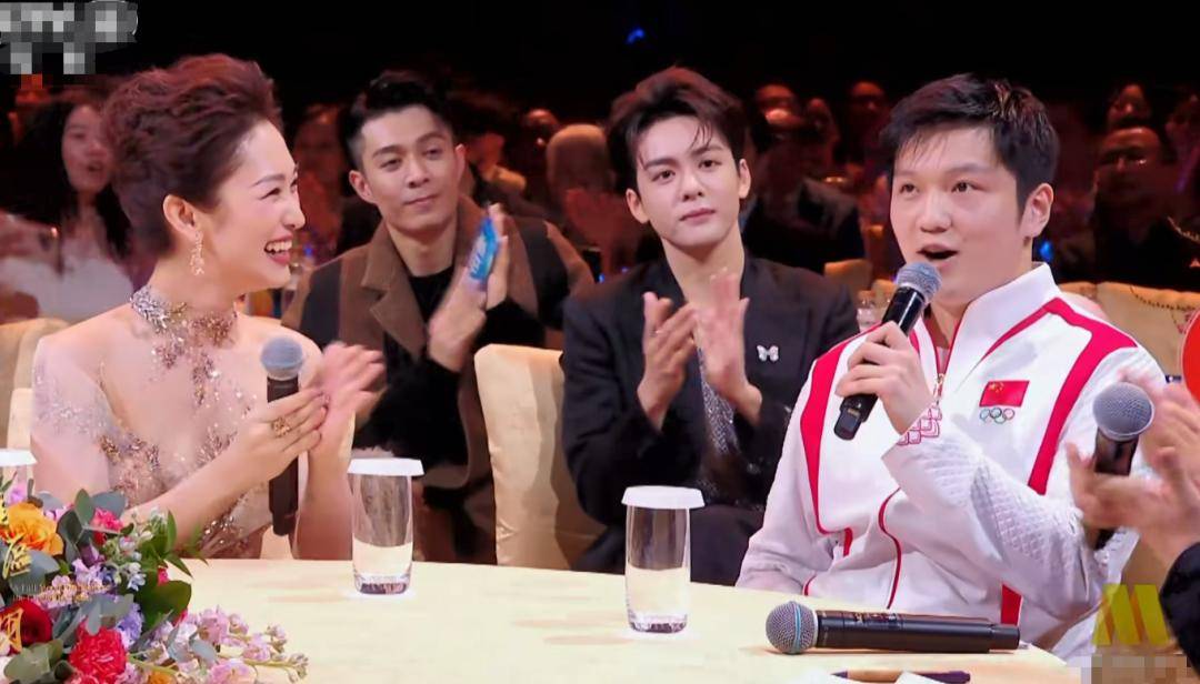 台下明星观众的互动也很有意思,主持人蓝羽在中场串场的时候邀请汪明荃和苏有朋、樊振东等人合唱《一生所爱》。