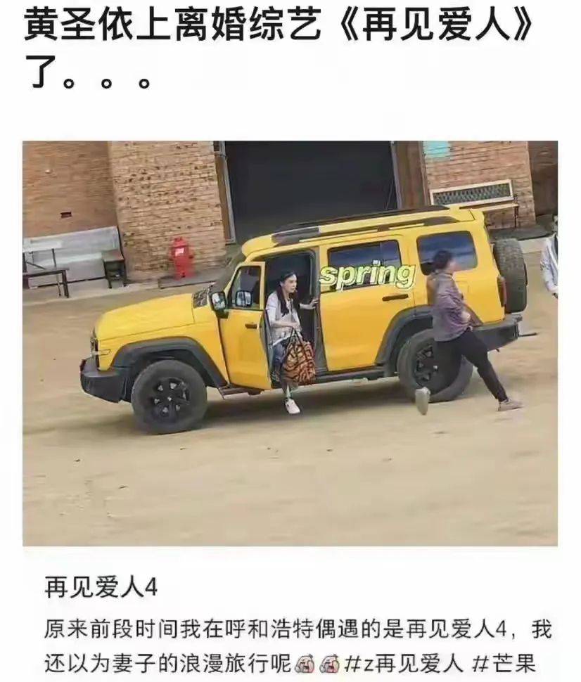 近日,有网友偶遇黄圣依和杨子录制《再见爱人》,看现场路透,杨子在一辆黄色吉普车旁,黄圣依正在下车,中间还有一名工作人员,这样大方露脸,看样子是在录制节目。