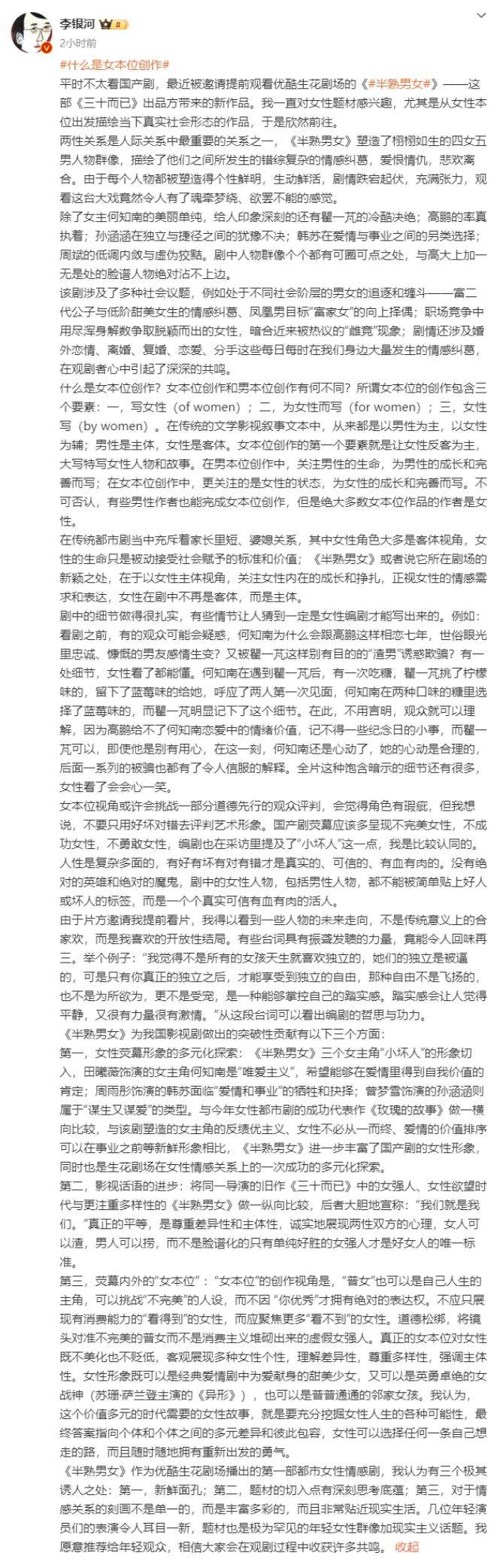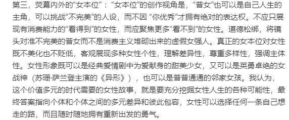甚少关注内娱电视剧的李银河在长文中写到生花剧场通过这部都市剧集做到了“女本位”的表达,让女性荧幕形象有了更为多元化的探索,也大方展现了女欲望时代不同个体的差异化,在某种程度上完成了影视话语的进步。