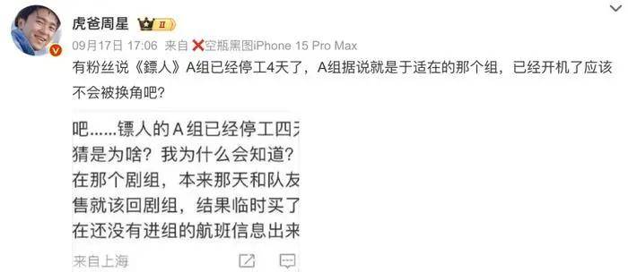 目前,一位大V透露,《镖人》A组已经停工四天了,于适就在那个组,但已经开机了,应该不会被换掉吧?