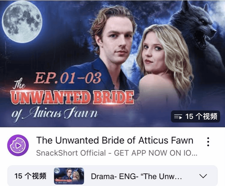 陈芊羽团队早期制作的短剧《Unwanted Bride》也是狼人题材,讲述了狼人与人类女孩的爱情故事。剧中的一些扇巴掌、摔杯子等传统狗血元素统统都有,同时,脱离现实的设定以及北美观众喜闻乐见的魔幻元素的加入,使这部短剧收到了不俗的播放量甚至有粉丝经常来催拍摄续集。