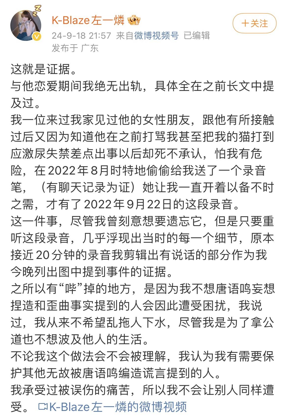 搜狐娱乐讯 今日女rapper K-blaze左一燐发文说自己被前男友rapper唐语鸣(艺名唐老师)暴打、抹黑、造黄谣,并放出被唐老师殴打时的录音。