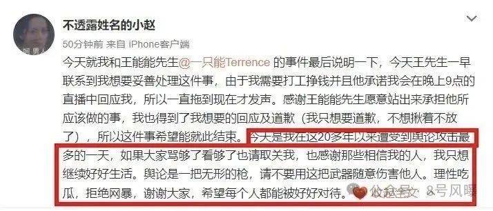 之后王能能本人在直播间回应和赵小姐的传闻,赵小姐才发文表示这件事到此结束。