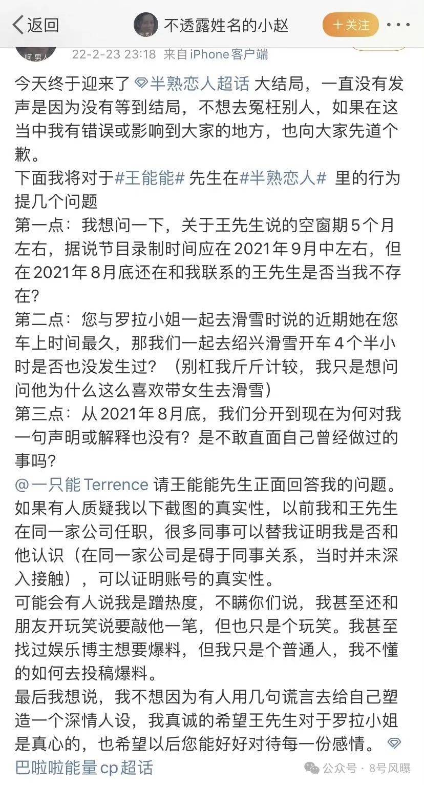 在节目收官后,一位名叫“不透露姓名的小赵”的网友爆料称,王能能上节目时声称有5个月的空窗期,但节目录制的前一个月,她和王能能还在保持联系。