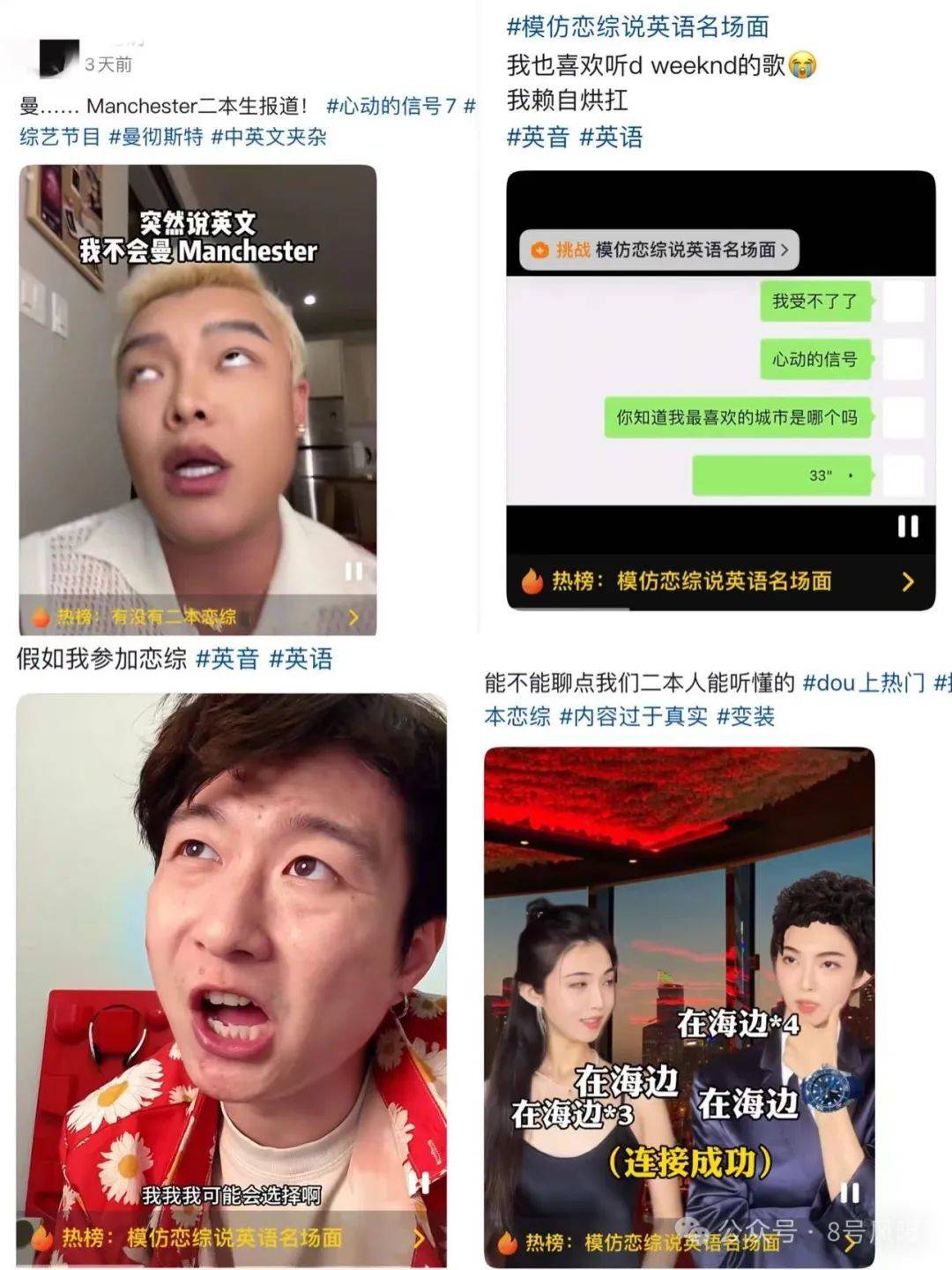 这种说话方式引发网友吐槽,大家还纷纷拍摄一些短视频来模仿他们的对话和动作。“模仿恋综说英语的名场面”一度登上了热门讨论话题。